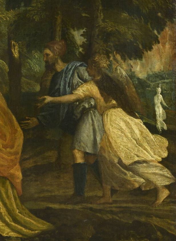 scène biblique (Loth, famille, jeune fille, fuite, ange, panier, chien) ; fond de paysage (feuillu, incendie, ville)