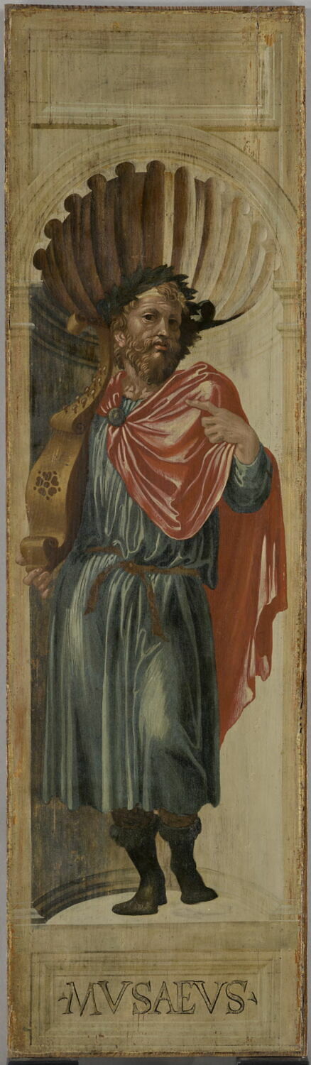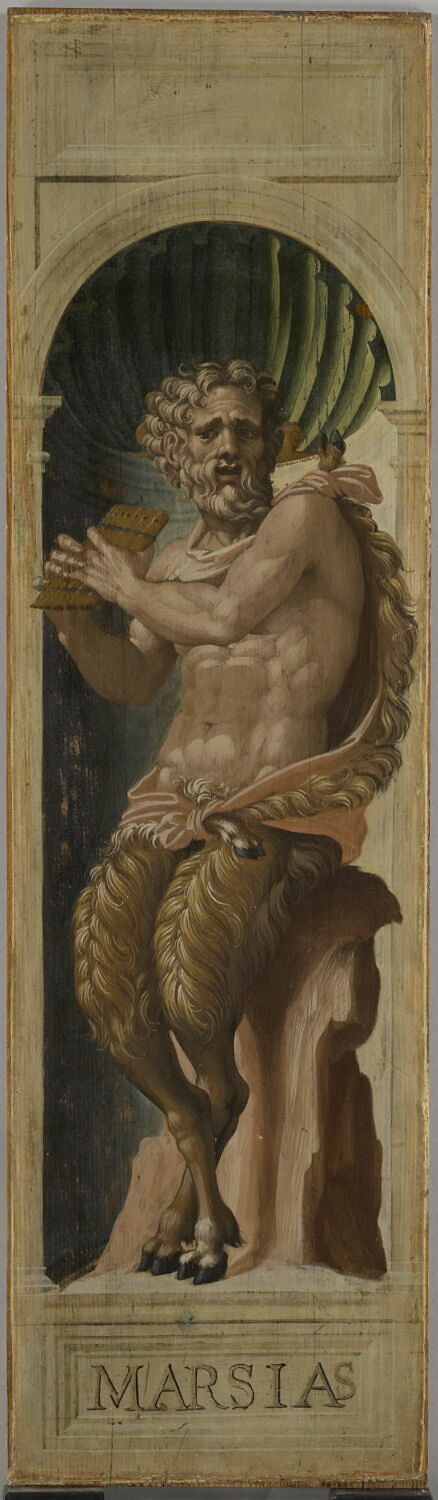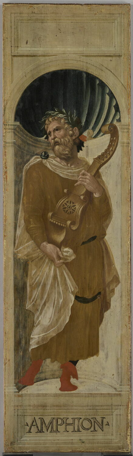 figure mythologique (Pan, homme, en pied, de trois-quarts, barbe, accoudé, flûte de Pan, décor d'architecture) ; figure mythologique (Amphion, homme, en pied, de trois-quarts, barbe, cordophone, couronne : laurier, ?, décor d'architecture) ; figure mythologique (Musée poète, homme, en pied, de face, cordophone, barbe, couronne : laurier, décor d'architecture) ; figure mythologique (Marsyas, en pied, de trois-quarts, barbe, flûte de Pan, décor d'architecture) ; verso ; ornementation (rinceau, feuille, ornement à forme animale : boeuf, ornement à forme animale : cervidé, ?, putti)