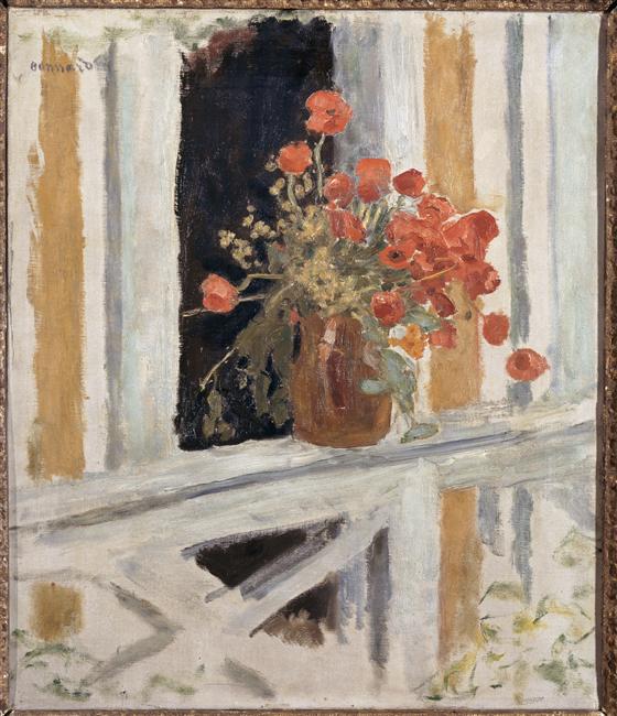 nature morte (bouquet, vase, coquelicot) ; maison (Vernon, ?, balcon, balustrade)