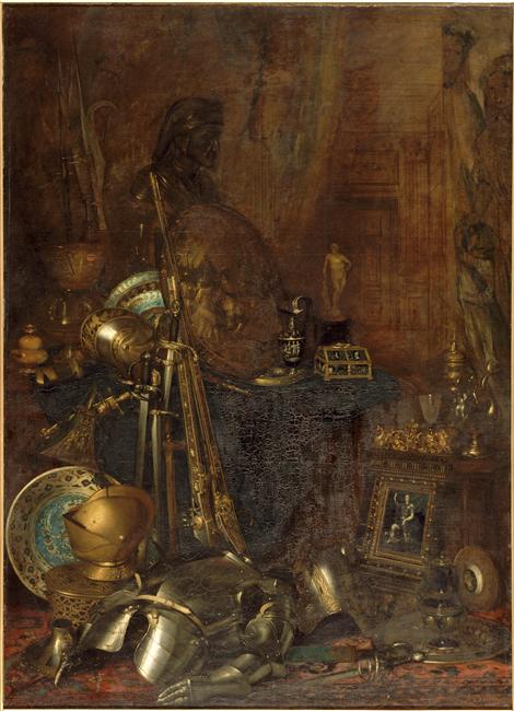 nature morte (armure, mousquet, tableau, ronde bosse, aiguière, objet, coffre, verre à pied)