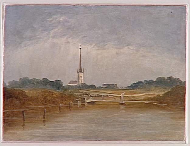 paysage (cours d'eau, voilier, église, berge, Eidsvoll)