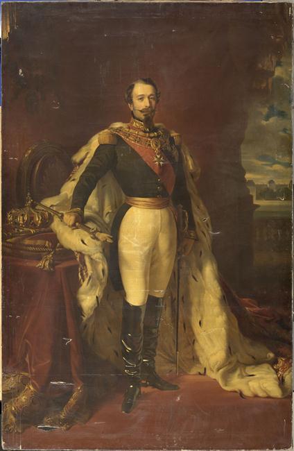 portrait (Napoléon III, en pied, de trois-quarts, Ordre de la Légion d'honneur, manteau : hermine, épée, sceptre, chaussure) ; couronne ; fond de paysage