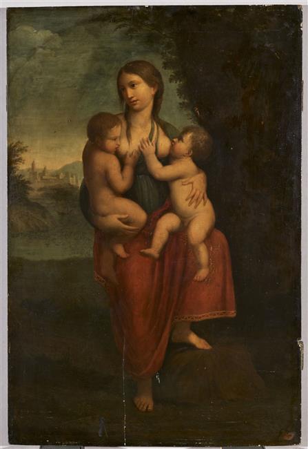 figure (femme, en pied, de face, allaitement, enfant, allégorie : charité) ; fond de paysage
