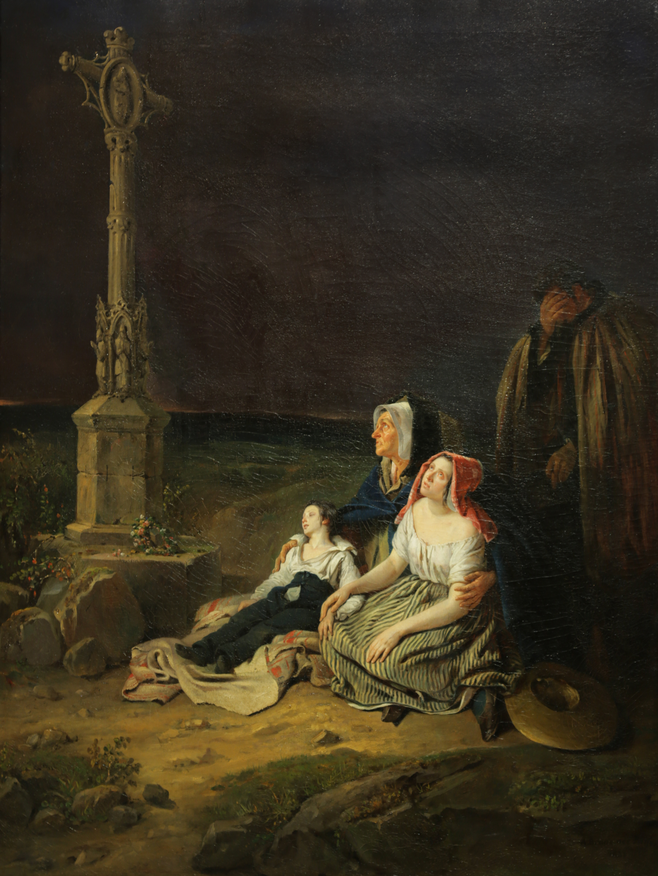 scène (femme, prière, enfant : agonie, croix monumentale)