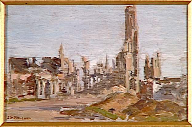 paysage (Ypres, église, clocher, maison : ruines, rue, ciel)