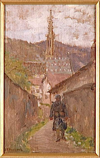 paysage (Thann, ville, église, clocher, rue, effet de perspective, maison, mur, soldat : Français, la marche, arbre, végétation, colline, ciel)