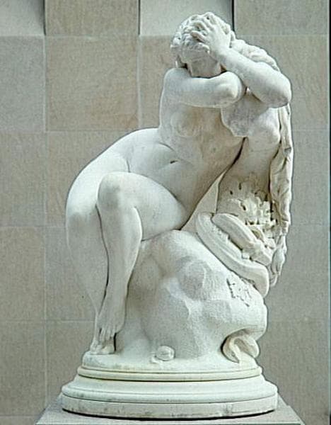 LE MODELE EN PLATRE EXECUTE A ROME EN 1867 COMME TRAVAIL DE TROISIEME ANNEE FUT ENVOYE A PARIS ET ACQUIS PAR L'ETAT EN 1869, SA LOCALISATION EST INCONNUE DE MEME QUE CELLE D'UNE MAQUETTE EN PLATRE DONNEE PAR DELAPLANCHE AU MUSEE DU LUXEMBOURG EN 1887 ; DES ESQUISSES EN CIRE FURENT DONNEES A LA NY CARLSBERG GLYPTOTEK DE COPENHAGUE PAR LA VEUVE DE DELAPLANCHE ; UN DESSIN EST CONSERVE AU CABINET DES DESSINS DU LOUVRE (RF 15 565) ; UN MOULAGE EN PLATRE ACQUIS EN 1892 ET CONSERVE AU MUSEE DU LOUVRE (RF 906) N'EST PAS LOCALISE ; IL POURRAIT ETRE LE MEME TIRAGE QUE CELUI EXECUTE SUR LE MODELE PRETE PAR MME DELAPLANCHE EN 1892? ; UN MOULAGE EST CONSERVE A LA NY CARLSBERG GLYPTOTEK DE COPENHAGUE, UN AUTRE AU MUSEE-CHATEAU D'ANNECY, UN TROISIEME AU MUSEE DE TOULON ; REDUCTIONS EN MARBRE DONT UNE PRESENTEE A L'EXP. UN
