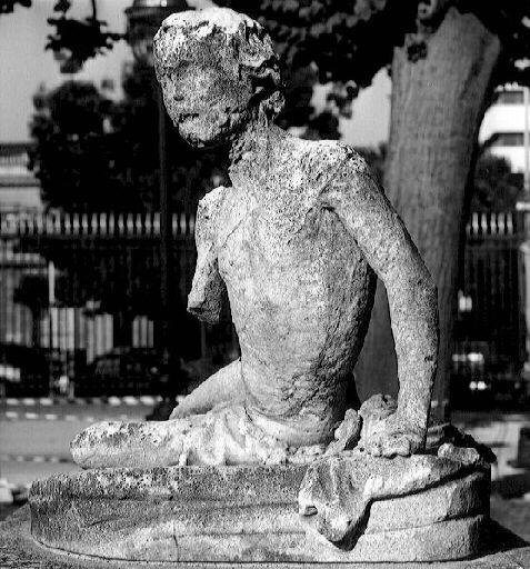 'Giotto est représenté par un enfant dénudé allongé, dont le buste a demi redressé, s'appuie sur le bras gauche tendu. Les traits du visage sont complètement effacés le marbre étant totalement rongé.'/Marie-Noëlle Maynard