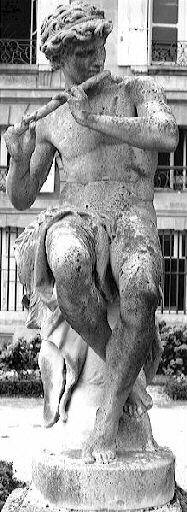 Un berger, nu, est assis sur un tronc d'arbre recouvert d'une peau de chèvre. Les jambes croisées, il joue de la flûte. Un bandeau ceint ses cheveux