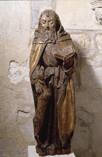 figure biblique (saint Gilles, en pied, vêtement religieux, ceinture, chapelet, moustache, barbe, livre, caresse : biche)
