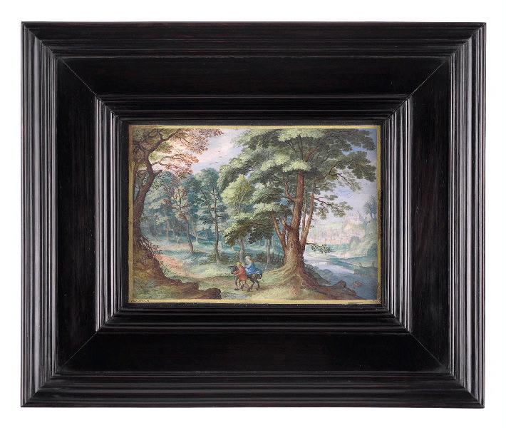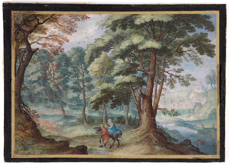 scène biblique ; paysage (Fuite en Egypte, âne, forêt, clairière, fleuve, village, fortification, pont)