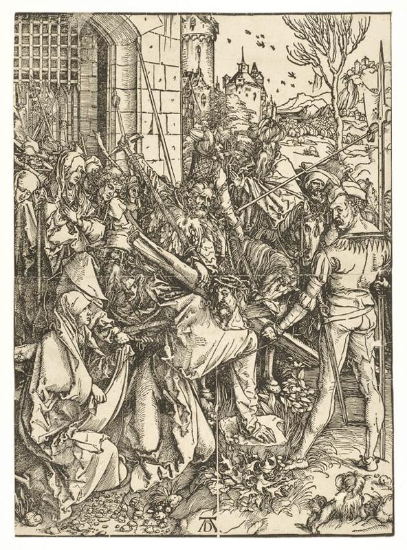 Le Christ est emmené pour être crucifié. il tombe sous le poids de la croix, pourtant soutenue par Simon de Cyrène, et Saint Véronique se penche sur lui afin de lui essuyer le visage. Si toute la partie droite est occupée par la garde, et les lansquenets, la gauche représente les alliés du Christ : Marie et saint Jean l'Evangéliste