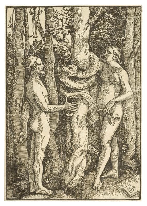Adam et Ève se font face de part et d'autre de l'arbre de la Connaissance autour duquel s'enroule le serpent. Adam, de profil et tout cambré, adopte une position sthénique mettant son corps athlétique en valeur, tandis qu'il tend derrière le dos sa main gauche tournée de manière à montrer au spectateur le fruit défendu, la pomme. Adam, de son bras droit à moitié replié et formant un angle droit, semble ponctuer tel un automate les paroles qu'il adresse à Ève, cependant qu'elle cueille une pomme placée haut dans l'arbre. Le regard tendu vers le fruit, Ève imprime une légère torsion à son corps qui s'offre ainsi à la vue du spectateur et lui permet de découvrir les formes pleines de son ventre et le modelé ferme de sa jambe gauche à dessein pointée vers l'avant, tandis qu'elle essaie de cacher sa nudité à l'aide d'une branche de figuier tenue avec une gracieuse aisance. L'impression de flexibilité que dégagent les formes ondoyantes de la jeune femme s'oppose au côté rigide d'Adam, présenté de surcroît en homme sensiblement plus âgé, souligné par le lichen moussu pendant aux branches d'arbres. À l'arrière-plan, le paysage sylvestre très touffu forme un écran de verdure sombre derrière Ève, et avec une échappée vers le ciel derrière Adam, l'arbre de la Connaissance formant l'axe vertical de séparation entre les deux univers. Les troncs d'arbres du second plan délimitent à leur tour l'espace d'action, fort restreint, dont disposent les deux personnages et contribuent à créer l'impression de l'étau qui se resserre. Proche du paysage paradisiaque de la gravure éponyme de Dürer (B. 1), celui de Baldung révèle un chevreuil à demi caché derrière le pied de l'arbre central, mais dépourvu de toute valeur symbolique, contrairement aux quatre animaux représentant les tempéraments de l'homme et visibles dans le burin de 1504 du Nurembergeois. Ainsi que l'ont souligné Mmes Durian-Ress et Bock, Baldung, sans s'intéresser plus avant à l'idéal développé dans la gravure de Dürer, s'est vraisemblablement inspiré d'une ouvre de 1505 qui lui est généralement attribuée, Le Crucifié entre La Chute de l'Homme et Le Sacrifice de la messe, extrait de l'ouvrage d'édification d'Ulrich Pinder paru à Nuremberg, Der beschlossen Gart des Rosenkrantz Mariae (Mende 88). De la même période, soit vers 1514, La Chute de l'Homme et L'Expulsion du paradis (Mende 34) constituent des pendants au même titre que L'Annonciation et La Nativité, datée 1514 (Mende 35, 36), mais fonctionnant comme une suite de quatre feuilles isolées : le premier diptyque évoque le péché originel du premier couple d'êtres humains, le second, l'incarnation du Christ, venu racheter l'homme de son péché. Une longue tradition littéraire et artistique fonde par ailleurs le rapprochement antithétique de Ève et Marie. Dans la gravure étudiée et son pendant, L'Expulsion du paradis, Ève est désignée comme jouant le rôle principal ; s'adressant à elle, Adam accompagne son argumentation d'un geste de la main, tandis qu'Ève, dans la séquence suivante, est la seule à oser jeter un regard au spectateur, un regard de détresse et une demande d'aide. Séparé physiquement et symboliquement par l'arbre de la Connaissance, le premier couple d'humains expérimente la culpabilité, vécue individuellement, et qui enferme chacun dans une prison. Adam et Ève ont perdu la liberté dont ils jouissaient au paradis et découvrent l'incommunicabilité entre eux et entre eux et le monde, ce que Baldung a magistralement traduit en attribuant à chaque zone sa valeur spatiale graphiquement individualisée, sans aucune confusion de genre possible. (Anny Claire Haus)