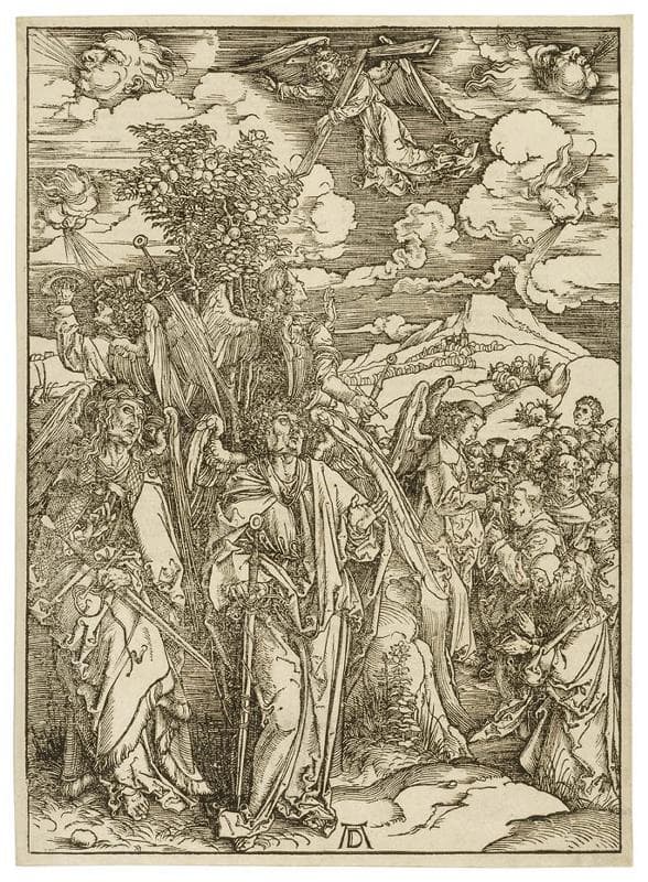 Dans la cinquième feuille, Dürer juxtapose deux épisodes consécutifs relatés dans les premiers versets du chapitre VII de l'Apocalypse (1-4). A gauche, le groupe des quatre anges 'debout aux quatre coins de la terre ' (verset 1), dessine ainsi les quatre points cardinaux et donne à leur action une dimension planétaire, dont le corollaire seront les vents, figurés par des têtes humaines joufflues qui soufflent dans les nuages, selon une iconographie remontant à l'Antiquité. Celles des angles supérieurs sont tournées vers l'extérieur et ont été mises hors d'état de nuire grâce aux deux anges monumentaux du premier plan. La seule puissance athlétique qu'ils dégagent vaut force de persuasion, même sans épée. Derrière eux, les deux figures ailées tentent de contrecarrer et de déjouer les méfaits intempestifs du vent. L'ange de gauche essaie d'une main de se protéger à l'aide d'un bouclier, de l'autre, de frapper de son épée dégainée, Borée, le plus furieux de tous les vents. Son partenaire à droite, d'un geste délicat mais ferme veut arrêter les méfaits du vent soufflant au-dessus de la foule assemblée à droite de l'image, celle qui intervient dans le cadre de l'épisode biblique suivant. D'une beauté sculpturale saisissante, l'ange placé au centre, capte immédiatement l'attention du spectateur et l'incite d'un geste de la main gauche à découvrir la deuxième scène, que seul l'arrêt des vents pouvait rendre possible. D'où l'impression de majestueuse pesanteur pétrifiée qui émane des deux anges du premier plan, si proches de figures de Mantegna. L'ordre de l'immobilisation des vents, en fait, est venu de l'ange planant dans le ciel et portant la croix, celui décrit comme tenant ' le sceau du Dieu vivant ' (verset 2) et qui intime au groupe des quatre anges ' [de ne pas] nuire à la terre, à la mer ou aux arbres ' (verset 3), aussi longtemps que les fronts des serviteurs de Dieu n'auront pas été marqués du sceau. (1626-1944). Dürer crée graphiquement le lien entre l'arbre de la connaissance, la chute de l'homme et la croix, du fait que celle-ci vient toucher l'arbre chargé de fruits ; de toute évidence un pommier. La croix, symbole de la Rédemption, devient également le signe de reconnaissance qui va marquer le front des serviteurs de Dieu, des élus, soit douze mille pour chacune des douze tribus d'Israël (verset 4). La croix devient donc signe de vie, celui que trace sur le front des élus l'ange gothique tenant un calice ; calice qui, symboliquement recueille le sang de l'Agneau.