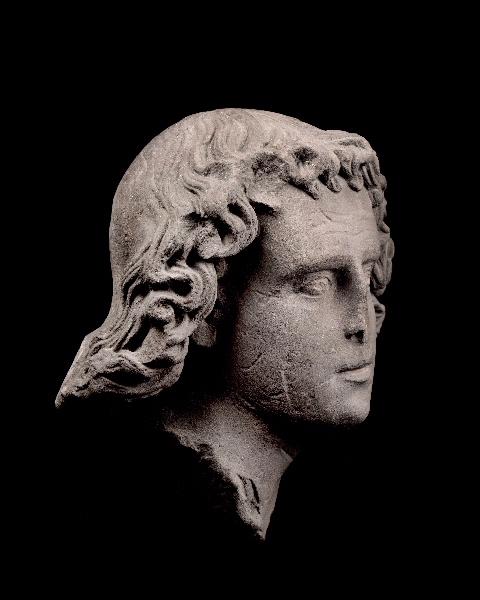Tête imberbe aux traits juvéniles, tournée vers la droite. L'abondante chevelure bouclée retombe sur le front. Modelé angulaire, lèvres entrouvertes, yeux rapprochés, en amande, front haut. Coupée au ras du cou. Nez cassé. Yeux et lèvre supérieure abîmés.