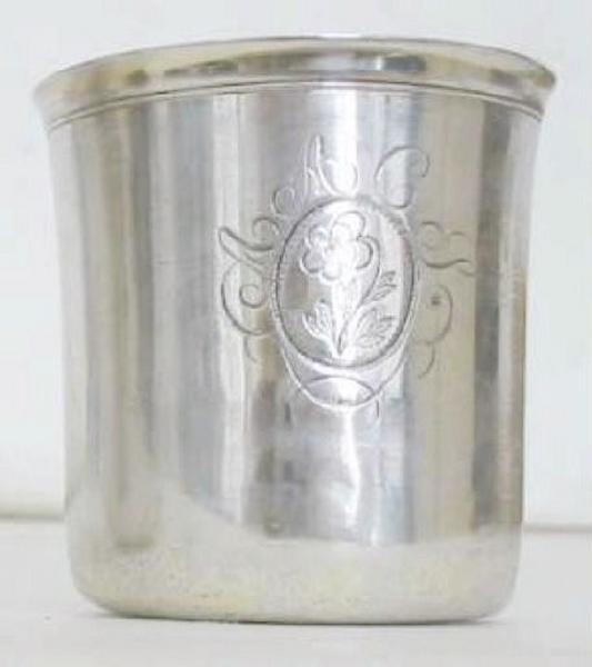 Gobelet droit à base arrondie et bord supérieur à légèrement évasé souligné d'un filet. Sur le corps figure une pensée inscrite dans un médaillon ovale environné du chiffre AACS qui se poursuit sur la partie inférieure par des volutes prenant naissance dans un ovale dont la partie inférieure est partiellement usée suite au dégravement d'un numéro à trois chiffres (226 ?) vraisemblablement rapporté postérieurement sur l'objet. Intérieur doré. Quelques restes de la dorure extérieure