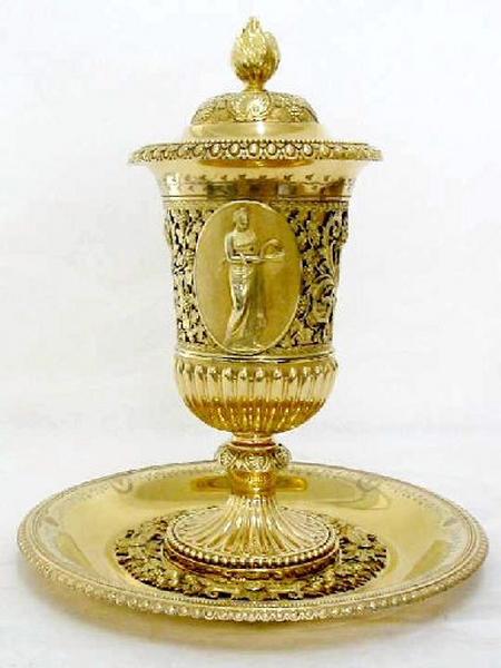 Coupe à pied en forme de vase Médicis. Les fruits en relief sur le plateau sont particulièrement bien travaillés, notamment leurs surfaces tantôt brillantes, tantôt mates. Les habitants de Strasbourg offrirent ce vase à leur maire, Jean-Frédéric Brackenhoffer, après le blocus de 1814
