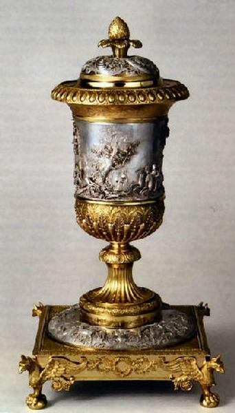 poinçon : Poinçon du maître; poinçons de second titre et de grosse garantie (années 1819-1838) ; inscription : Sur le bas-relief, la signature: 'Kirstein orfevre', et sur le pourtour du piédouche: 'Composé et exécuté par Kirstein, Orfèvre à Strasbourg 1821.'