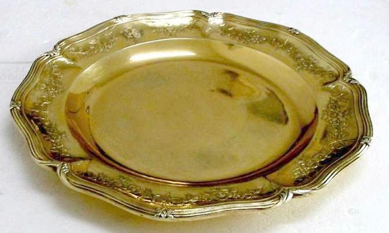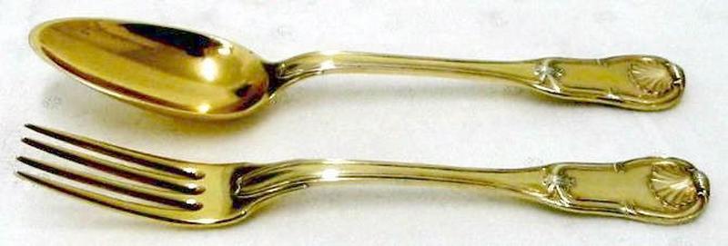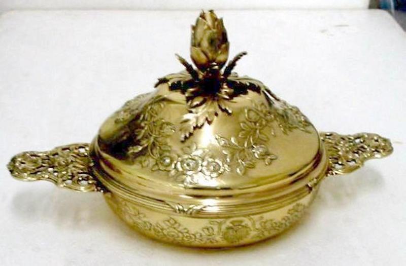 écuelle couverte avec présentoir et couvert ; écuelle à deux oreilles ajourées au décor en fort relief, finement gravé et ciselé, constitué d'une bordure moulurée de filets enrichie de feuilles d'acanthe et d'une élégante agrafe en panache, le tout enserrant une corbeille débordant de roses. Sous le bord extérieur court une guirlande gravée et ciselée de branches de rosiers fleuris prenant naissance au niveau des anses horizontales. La guirlande est relevée au centre de la face avant afin de dégager les armoiries gravées, et suspendue au centre de la face arrière par un noeud de ruban. Le couvercle à doucine et bordure extérieure moulurée de filets interrompue par des agrafes et des feuillages, est souligné d'un décor floral repoussé, ciselé et délicatement gravé. Il s'agit d'une guirlande de branchages fleuris en trois festons suspendus par des noeuds de ruban au bouton de prise. Ce dernier, en forme d'artichaut, repose sur une terrasse de feuilles d'acanthe très animées, l'ensemble étant fixé au revers du couvercle par un écrou en forme de bouton de fleur. Le présentoir contourné, à cinq accolades et bord extérieur mouluré de filets, est orné sur le marli d'une guirlande de branchages fleuris rattachées alternativement au bord extérieur par des agrafes ou des feuillages. Le noeud est remplacé au centre de l'un des lobes par les armoiries gravées. Le couvert est à modèle violon à filets. La spatule est enrichie sur les deux faces d'un décor de coquilles, d'agrafes et de feuillages. Cet ensemble est conservé avec son écrin d'origine en marocain rouge, passé au fauve dans les parties exposées à la lumière, doublé de chamois. Des rosaces et des frises dorées de fleurs et de palmes, exécutées à la roulette et aux petits fers, agrémentent les bords du couvercle en deux parties