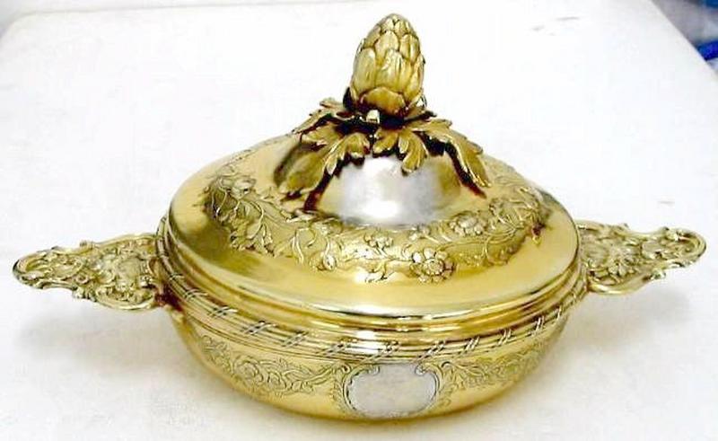 Ecuelle unie à deux oreilles ciselées de volutes et coquilles et centrées d'une rose. Couvercle à moulure de filets et à prise en artichaut sur une terrasse de feuilles d'acanthe. Une écuelle couverte en argent doré (1772-1774), du même auteur et d'un modèle très similaire, à décor identique pour les anses et le bouton de prise, mais ayant conservée son présentoir, figure au n° 90 du catalogue Sotheby's, Paris, vente du 18 déc. 2002