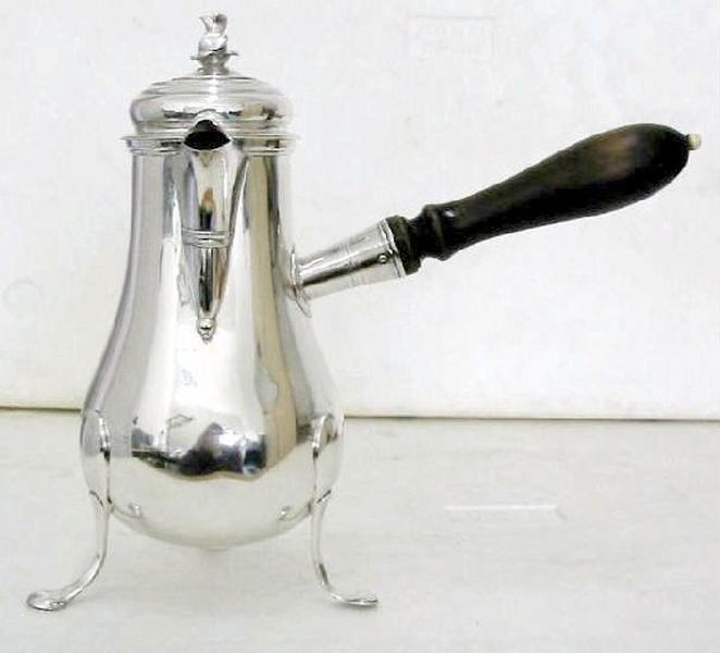 Corps en balustre reposant sur 3 pieds à attaches en forme de spatule. Bec verseur appliqué orné d'un jonc mouluré à filets et d'un fleuron stylisé à la base du versoir. Couvercle à terrasse pivotante munie d'un bouton feuillagé et appui-pouce nervuré à enroulement. Manche latéral en bois anciennement noirci se terminant par une petite boule d'ivoire