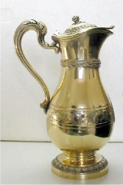 Aiguière appartenant au nécessaire de la comtesse von der Leyen ; Offert à la comtesse Sophia Therese von de Leyen pour la naissance de son fils Erwein en 1789. Collection Roger Ehrhardt, Schiltigheim. Vente Drouot, Paris, Collection Roger Ehrhardt, 1939, n°22. Acquis lors de la vente par Maurice Burrus et offert en 1946 au musée des Arts décoratifs de Strasbourg