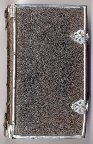 Reliure en chagrin noir (cuir grenu, fait de peau de mouton, de chèvre, d'âne), avec encadrement en argent pour les plats. La garniture en argent ajouré et gravé comprend uniquement les coiffes des dos ornés d'arabesques et les fermoirs ornés de même et agrémentés de têtes de séraphins ailés ; Neues Gesang-Buch, Strasbourg, Johannes Beck, 1747. Y est insérée une vue de Strasbourg en frontispice, gravure signée ' Weis Sc. 1752 ', mentionnant le nom de l'imprimeur. Livre de cantiques luthériens