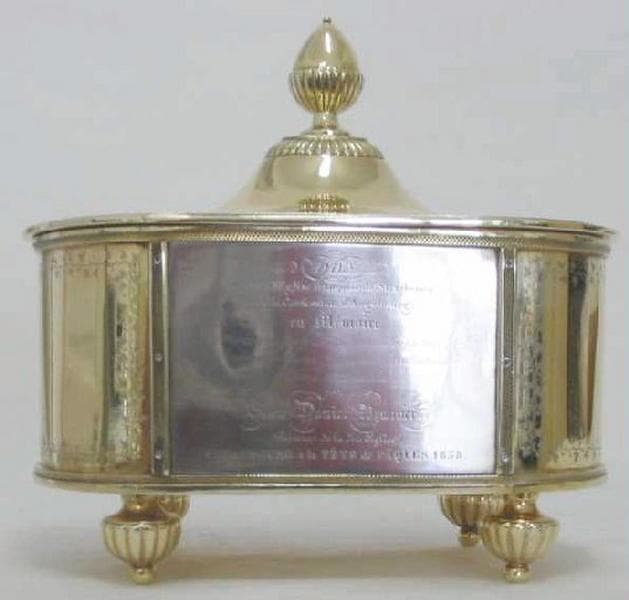 Argent et argent doré ; Boîte à hosties rectangulaire aux côtés latéraux arrondis. Elle repose sur 4 pieds en toupies godronnées. Les 2 faces longitudinales sont agrémentées l'une d'un bas-relief représentant 'Le Repas d'Emmaüs' d'après Appiani, l'autre d'une plaque en argent portant une inscription gravée dans différents types de caractères, certains richement calligraphiés. Les bords de la boîte et des plaques rivetées sont soulignées de fines moulures appliquées, gravées de motif de croisillons. Les côtés latéraux unis sont encadrées d'une frise de lierre ciselée. Le couvercle plat s'élève progressivement en son centre pour recevoir , sur une terrasse godronnée, le bouton en forme de gland godronné sommé d'une perle. Le bord extérieur du couvercle est gravé d'une moulure en creux assortie à celles de la boîte. L'iconographie de la scène qui orne la boîte à hosties est directement liée à sa fonction. Le style de ce relief est identique à celui de La Cène d'après léonard de Vinci figurant sur le calice MAD XXXI.142 a, b. Il se démarque très nettement de la manière pratiquée par Jacques Frédéric Kirstein. On n'y retrouve pas la parfaite maîtrise de l'anatomie humaine et la fluidité du modelé propres à l'artiste.