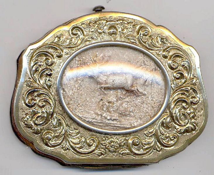 Argent partiellement doré ; petit porte-monnaie à charnière ouvrant sur le dessus. Il contient un soufflet à trois compartiments en taffetas de soie rose gansé de chevreau. Les deux faces en argent doré, repoussé et ciselé sont ornées distinctement. A l'arrière, un motif d'arabesques de style mauresque entoure un cartouche où figure l'inscription 'Souvenir'. A l'avant, volutes charnues de feuillage et fleurs repoussées se détachent sur un fond amati et encadrent un médaillon ovale central. Il s'agit d'un minuscule haut-relief ovale en argent fondu représentant un jeune cerf en pleine course, au plus sombre de la forêt, sautant par-dessus un taillis. La plaque et son verre de protection bombé sont sertis d'un cerclage en argent qui maintient l'ensemble dans le cadre ouvragé et plein de fantaisie que constitue ce porte-monnaie.