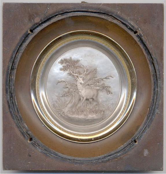 Argent, métal doré, métal noirci, bois, verre ; Dans un cadre en poirier teinté façon noyer foncé est enchâssé au creux d'une gorge de format circulaire, un haut-relief en argent fondu épousant ce même format. Le relief est serti d'un double cerclage: l'un en argent avec frises de perles, l'autre en métal doré avec frise de palmettes. L'ensemble est protégé par un verre plat fixé à la surface du cadre par un cerclage en métal noirci à frise de perles et de rais-de-coeur. La scène représente le brame du cerf. L'animal solitaire est posté devant un vieux chêne brisé. le fin travail de ciselure confine à la virtuosité dans le rendu du pelage du cervidé, de l'écorcé du chêne et de la végétation couvrant le talus en herbé qui est agrémenté, selon le procédé cher à l'artiste, d'une touffe d'herbe en feuille d'argent découpée et rapportée. Le traitement très élaboré du relief est mis en valeur par le fond uni sur lequel il se détache.