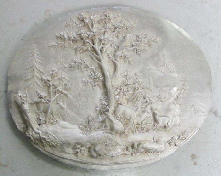 Argent, bronze ciselé et doré, bois noirci et verre ; Une plaque en argent fondu et ciselé représente une remise de chevreuils regroupant un chevreuil, deux biches et un brocard. La composition s'organise autour du groupe central de chênes planté sur un talus enherbé. le paysage arboré, où se mêlent feuillus et résineux au milieu de rochers, évoque la forêt vosgienne. Une ouverture sur le côté droit de la scène dévoile un lointain montagneux. Une vieille souche aux racines tentaculaires et des touffes d'herbe en fines feuilles d'argent découpées et rapportées ajoutent la touche pittoresque et vériste de Jacques F. Kirstein. Un élégant cadre rectangulaire en bois noirci, rehaussé de bronzes dorés en applique, sert d'écrin au haut-relief qui y est maintenu par un cerclage en bronze doré mouluré de frises de perles et de palmettes. Ce cerclage ovale est inséré dans un rectangle délimité par une frise de perles en bronze doré. Palmettes et rinceaux feuillagés prennent place dans les écoinçons ainsi formés. Le verre plat de protection est maintenu en retrait de la doucine extérieure du cadre par une plate-bande en bronze doré à frise de palmettes, rehaussée aux quatre angles par une rosette en argent. Bois noirci et bronze doré ajoutent encore en raffinement aux tableaux en argent fondu. Un tableau en relief similaire est conservé dans les collections du Mobilier National (CMLC 1175)