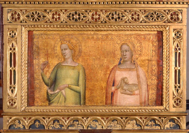 Fragment de prédelle. Sur un fond d'or gaufré, deux saintes vues à mi-corps et de trois quarts à gauche. L'une couronnée est vêtue d'une robe verte, et tient en main un petit crucifix; l'autre, enveloppée d'un manteau rose, tient dans ses mains un agneau.
