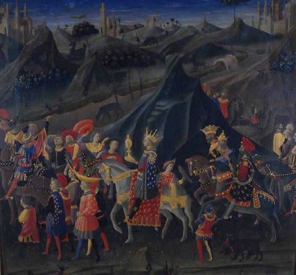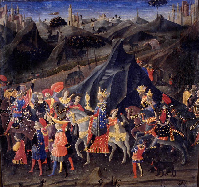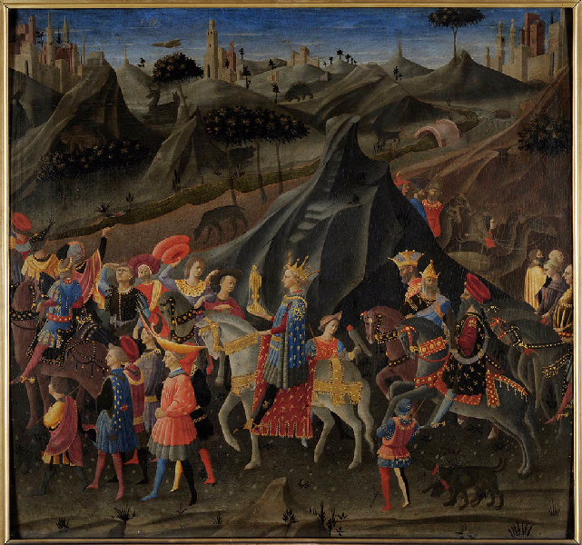 Dans un paysage accidenté où coule une rivière, se déroule le cortège des rois mages, venant de la droite et contournant une colline. Précédé de gens de pied et de cavaliers, un jeune roi monté sur un cheval gris occupe le centre de la composition. Il tient dans sa main droite un calice d'or recouvert d'un voile, derrière lui s'avancent les deux autres rois accompagnés d'un cavalier âgé et suivis d'autres hommes à cheval. A la fin du cortège, plusieurs chameaux. Au loin, se détachant contre le ciel, la silhouette de châteaux et de villes fortifiées.