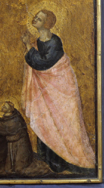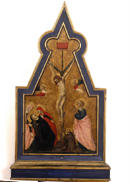 La croix faite d'un tronc d'arbre occupe le centre de la composition, le Christ est déjà mort, la tête inclinée, deux petits anges volent sur les côtés, l'un recueillant le sang qui jaillit du flanc du Sauveur. A gauche, la Vierge, vêtue de bleu sombre, défaille entre les bras des saintes femmes; à droite, saint Jean vêtu d'une robe bleue et d'un manteau rose joint les mains en regardant son maître avec compassion. Agenouillé au pied de la croix, saint François l'enserre de ses bras. Grâce à sa forme particulière, ce panneau peut être identifié comme le pinacle d'un retable.