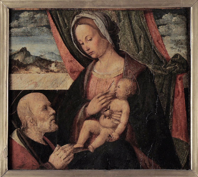 La Vierge vue jusqu'aux genoux, assise de trois quarts à gauche,vêtue d'une robe rose et d'un manteau bleu, un voile de linge sur la tête, allaite l'Enfant nu tenant des cerises dans chaque main. Agenouillé à gauche, saint Joseph, les mains jointes, en adoration. Fond de paysage montueux caché partiellement par un rideau vert double de rouge, placé derrière la Vierge.