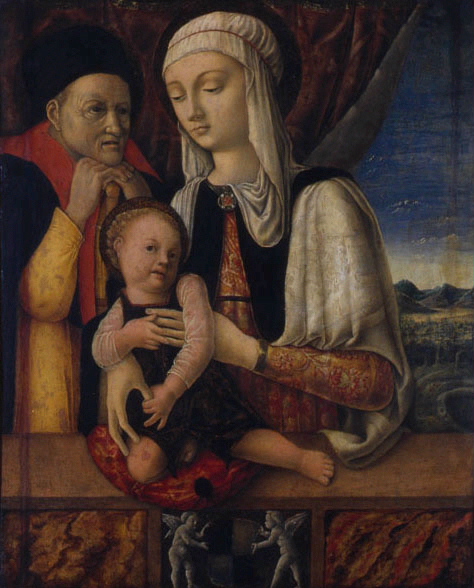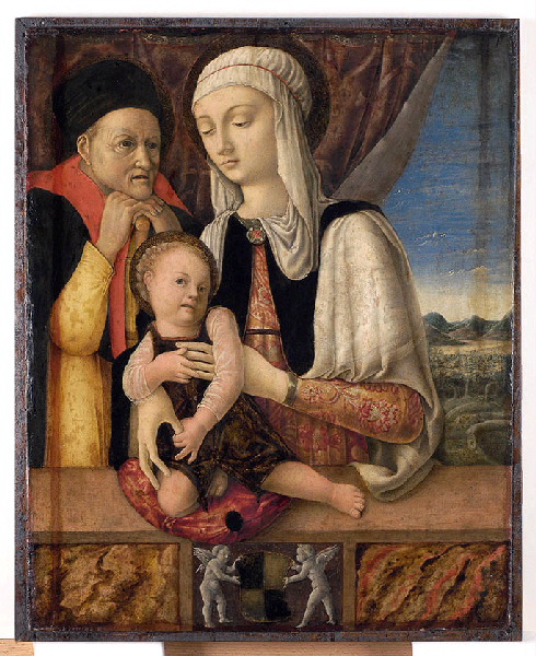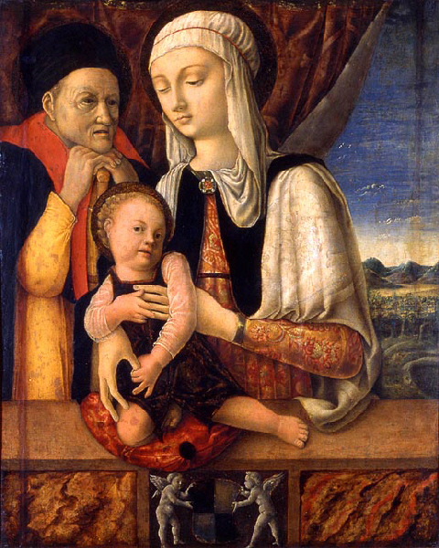 La Vierge debout, vue à mi-corps, vêtue d'une robe de brocart et d'un manteau noir doublé de blanc relevé sur l'épaule, un voile blanc serré autour de la tête, tient son Fils sur le rebord d'un appui de marbre aux armes de Barbe de Brandebourg, princesse de Mantoue; l'Enfant Jésus agenouillé sur une jambe, et étendant l'autre, serre dans ses doigts ceux de la Vierge et regarde le spectateur. Derrière lui, saint Joseph, glabre, en robe jaune et manteau noir regarde devant lui, le menton posé sur ses mains qu'il a appuyées sur son bâton. Fond de rideau de damas violet relevé vers la droite et laissant apparaître un paysage avec forêt et lointain de collines. Ciel bleu foncé, clair à l'horizon.