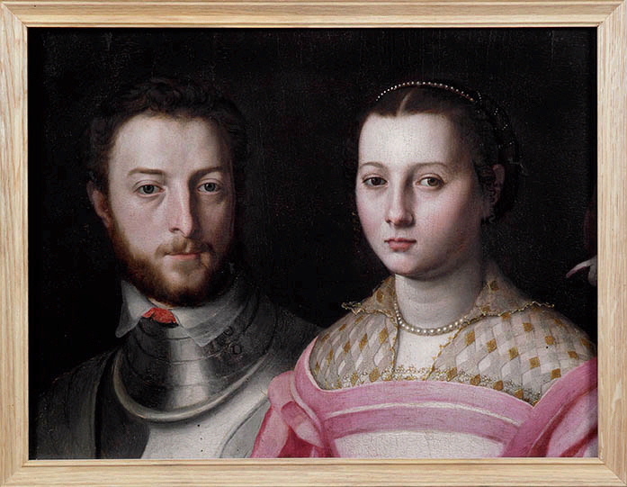 Ils sont représentés en buste, la femme légèrement en avant et le visage vers la gauche. Elle est très jeune encore et porte sur ses cheveux bruns un rang de perles et une torsade d'or; elle est vêtue d'une robe rose dont le décolleté présente une guimpe treillagée brodée d'or. L'homme, le visage légèrement tourné vers la droite porte une légère barbe châtain autour du visage, sa cuirasse est agrémentée d'un dépassant rouge et d'un col de linge blanc. Fond brunâtre.