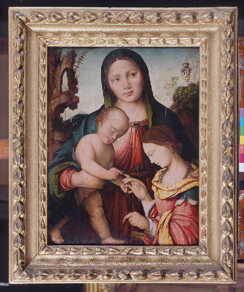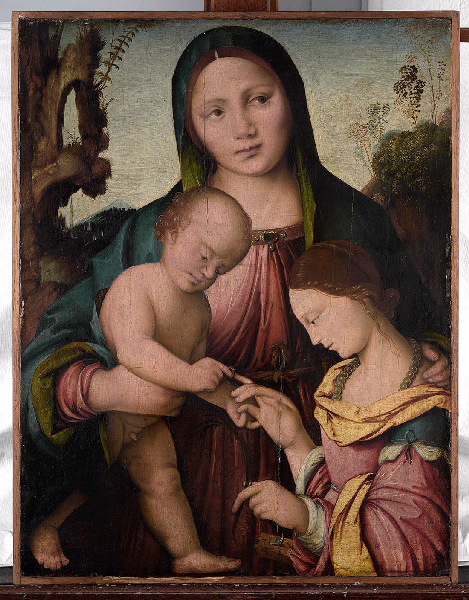La Vierge, de face, légèrement inclinée à gauche est vêtue d'une robe rouge et d'un manteau bleu doublé de vert. Sa main repose légèrement sur l'épaule de sainte Catherine tournée de profil à gauche. De son bras droit elle soutient l'Enfant qui, penché vers la sainte lui passe l'anneau au doigt. Le groupe est encadré de parois rocheuses; au fond, échappée sur un paysage accidenté, avec silhouette de ville.