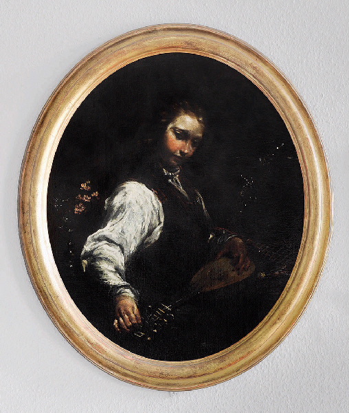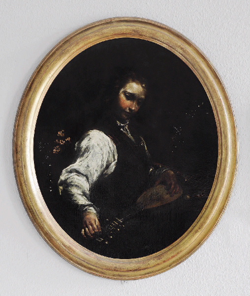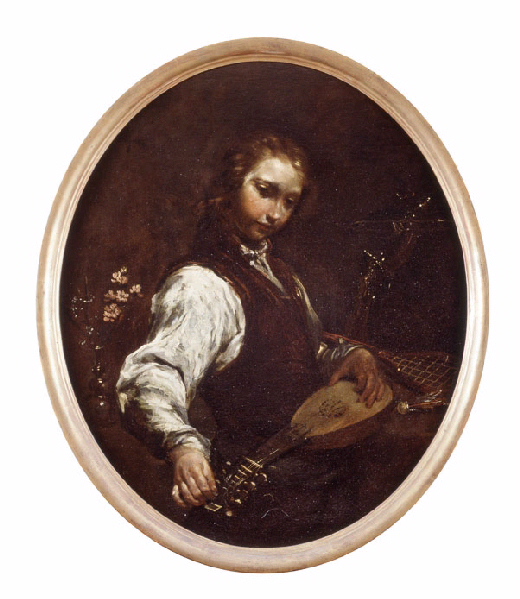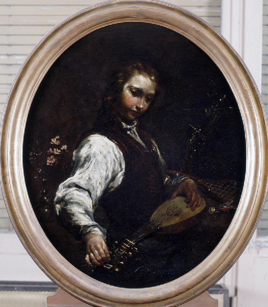 Un jeune homme, vêtu d'une chemise blanche et d'un veston brun-rouge accorde une pandurina posée sur ses genoux. Assis de trois quarts, il est entouré des instruments de ses loisirs : une raquette et un volant sont posés sur une table, une arbalète est laissée contre un mur. Derrière le personnage, un vase avec des fleurs claires prend également place sur une table. Le personnage, unique protagoniste du tableau se détache d'un fond très sombre.