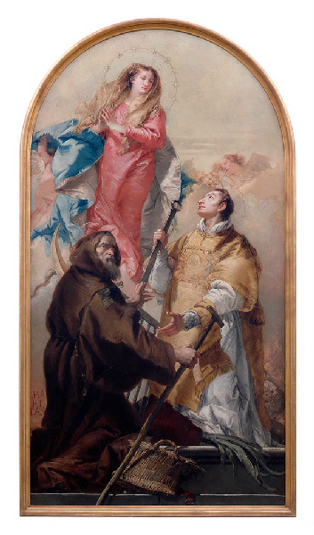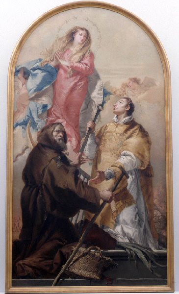 scène (Vierge, gloire, saint Laurent diacre, saint François de Paule, prière, croissant de lune, couronne : étoile, serpent, gril, panier, draperie)
