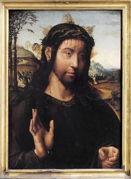 Il est vu en buste de trois quarts à droite, vêtu d'une robe brune et couronné d'épines lui déchirant le front. Des gouttes de sang et des larmes sillonnent son visage et de la main droite il bénit. Derrière lui un paysage montagneux au fond duquel on aperçoit à droite des édifices et des collines, et à gauche la montée au Calvaire et Jésus tombant sous la poids de la croix.