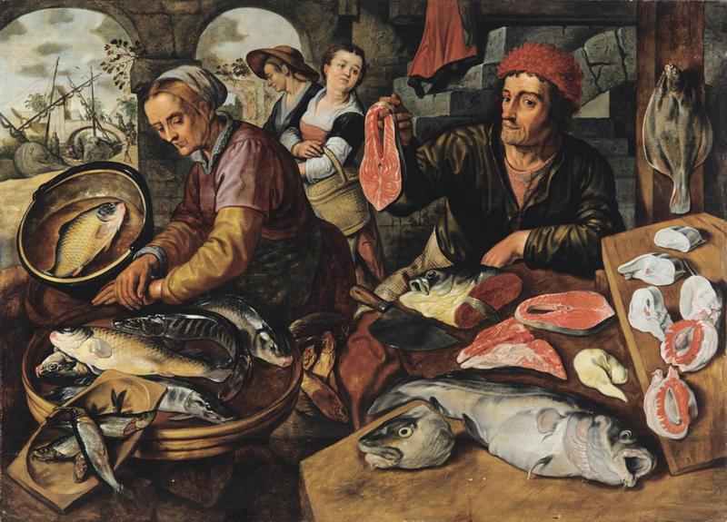 A l'intérieur d'un portique, dont les baies permettent la vue sur un paysage fluvial flamand avec ponts, tours et bateaux, un couple de marchands de poissons s'affaire autour d'un étal et de plusieurs baquets de bassines, offrant des poissons de toutes tailles, soit entiers, soit coupés en tranches. Deux clientes passent derrière le couple, près d'un escalier montant à l'étage. Composition polychrome dans laquelle le rouge des saumons, un bonnet et une étoffe pendante donnent une note dominante.