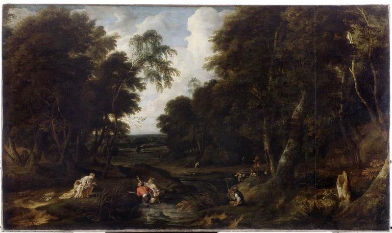 Grand paysage de forêt. Au centre clairière avec une mare et une échappée vers un paysage aux grands horizons. A gauche, Latone se tourne vers deux paysans dans l'eau qui l'insultent. Autour de la mare, d'autres paysans
