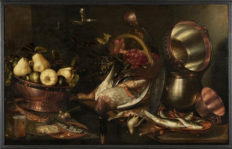 Sur deux tables placées de biais, et à des hauteurs différentes, des fruits, des légumes, des poissons sont disposés en un savant désordre parmi des bassines de cuivre. A gauche un verre de bière et un couteau, à droite, sous un égouttoir à poissons, un rouleau à pâte. Fond sombre sur lequel se détache un chandelier en laiton, fixé au mur par un bras de fer.