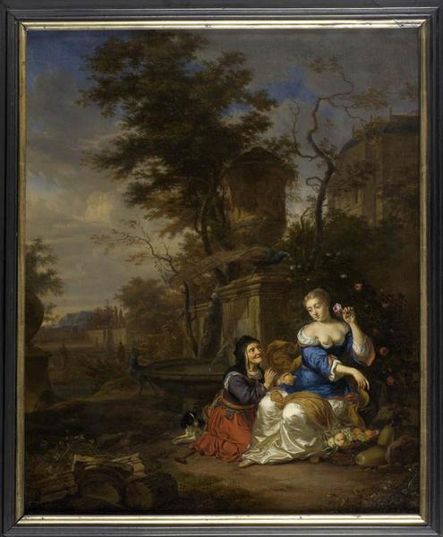 scène mythologique (Vertumne, déguisement, femme : vieille, Pomone, jardin, fontaine, chien, paon)