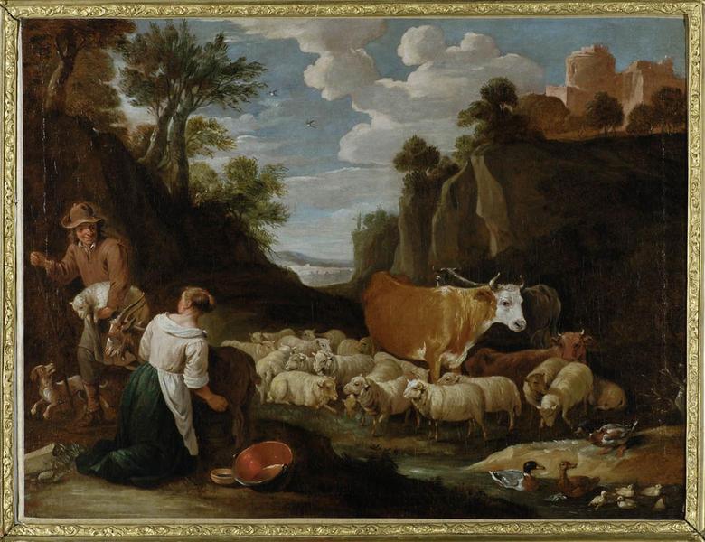 Dans une vallée à l'issue resserrée entre des rochers, un couple de bergers avec leur bétail. Au premier plan à gauche la bergère, à genoux vue de dos, trait une chèvre, près d'elle, une bassine de cuivre et un bol. Elle se retourne vers un berger qui se met en route vers la gauche, un agneau sous le bras, accompagné de son chien. Au centre moutons et vaches. Au premier plan, des canards s'ébattent dans un ruisseau. Toutes les figures se détachent en clair sur le fond sombre formé à gauche d'arbres et à droite de rochers. Au centre, échappée vers un lointain ensolleillé sous un ciel bleu chargé de nuages