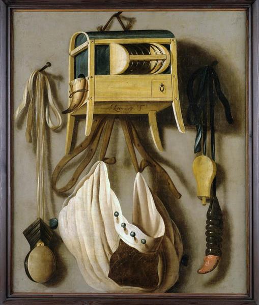 Nature morte sur fond gris moyen comportant en haut, au milieu, une petite cage en bois, à quatre pieds, munie d'un grillage arrondi, d'un tiroir et, sur le côté, d'une corne; la cage est attachée par une petite corde à un clou. Derrière elle se trouve l'attache d'une lanière en toile beige, avec quatre boutons métalliques à la partie supérieure et ouverture carrée à résille au milieu, le tout retenu par des lanières de cuir fauve.