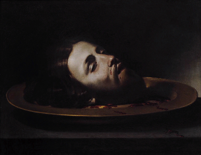Ce tableau montre le chef décapité de saint Jean Baptiste, posé sur un plateau. Le bourreau vient d'achever sa sinistre besogne et Salomé va l'apporter à Hérode et Hérodiade.