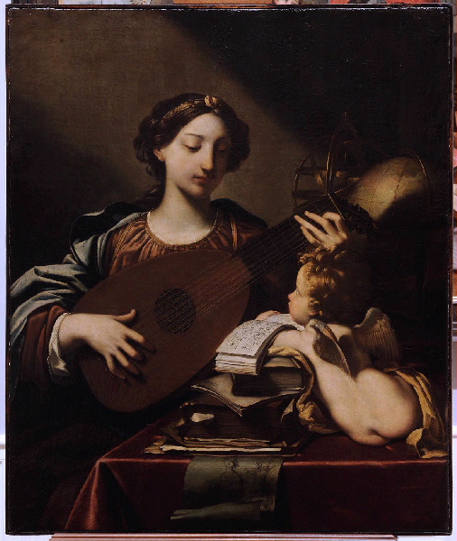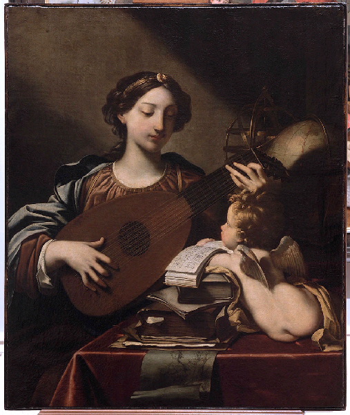 scène (allégorie, musique, luth, violon, globe, livre, partition)