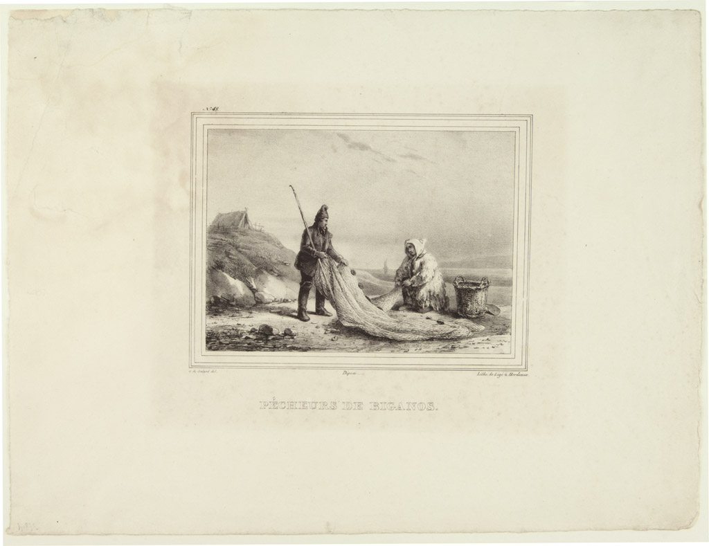 Nous sommes à l'embouchure de la Leyre. Deux pêcheurs, dont un encapuchonné et couvert d'une peau de mouton, raccommodent leurs filets. A gauche, une hutte de pêcheurs, au fond, le bassin d'Arcachon et les dunes; une pinasse à la voile paraît à l'horizon. Gravure extraite de l'Album départemental ou Bordeaux et ses environs par Gustave de Galard. Bordeaux, 1829. Troisième album